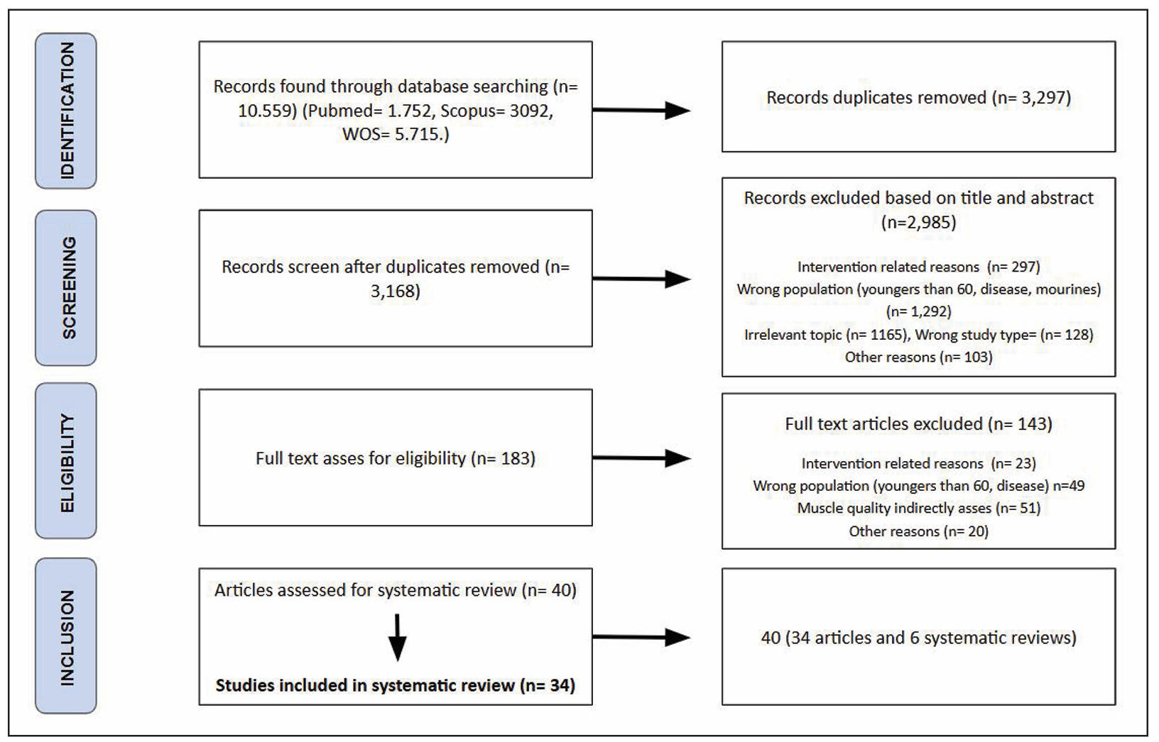 The initial search strategy was developed by one reviewer (NV) specifically for PubMed (outlined below), targeting title, abstract, and keyword fields. This strategy was subsequently adapted to conform with the syntax and subjectspecific headings of additional databases. A comprehensive literature search was then executed in PubMed, Web of Science, and Scopus databases, employing Boolean operators to combine relevant keywords systematically (aged OR old OR elder* OR aging OR frail* OR older OR senior OR geriatric) AND (measure* OR determine OR analyze OR evaluate OR “sensitivity and specificity” OR screening OR tool* OR assess* OR “diagnostic accuracy”) AND (“muscle function” OR “muscle performance” OR “muscle functional performance” OR “muscle functional capacity” OR “muscle quality” OR “functional domain” OR “muscle quality index”). The search was performed without date restriction and was updated until October 2024.