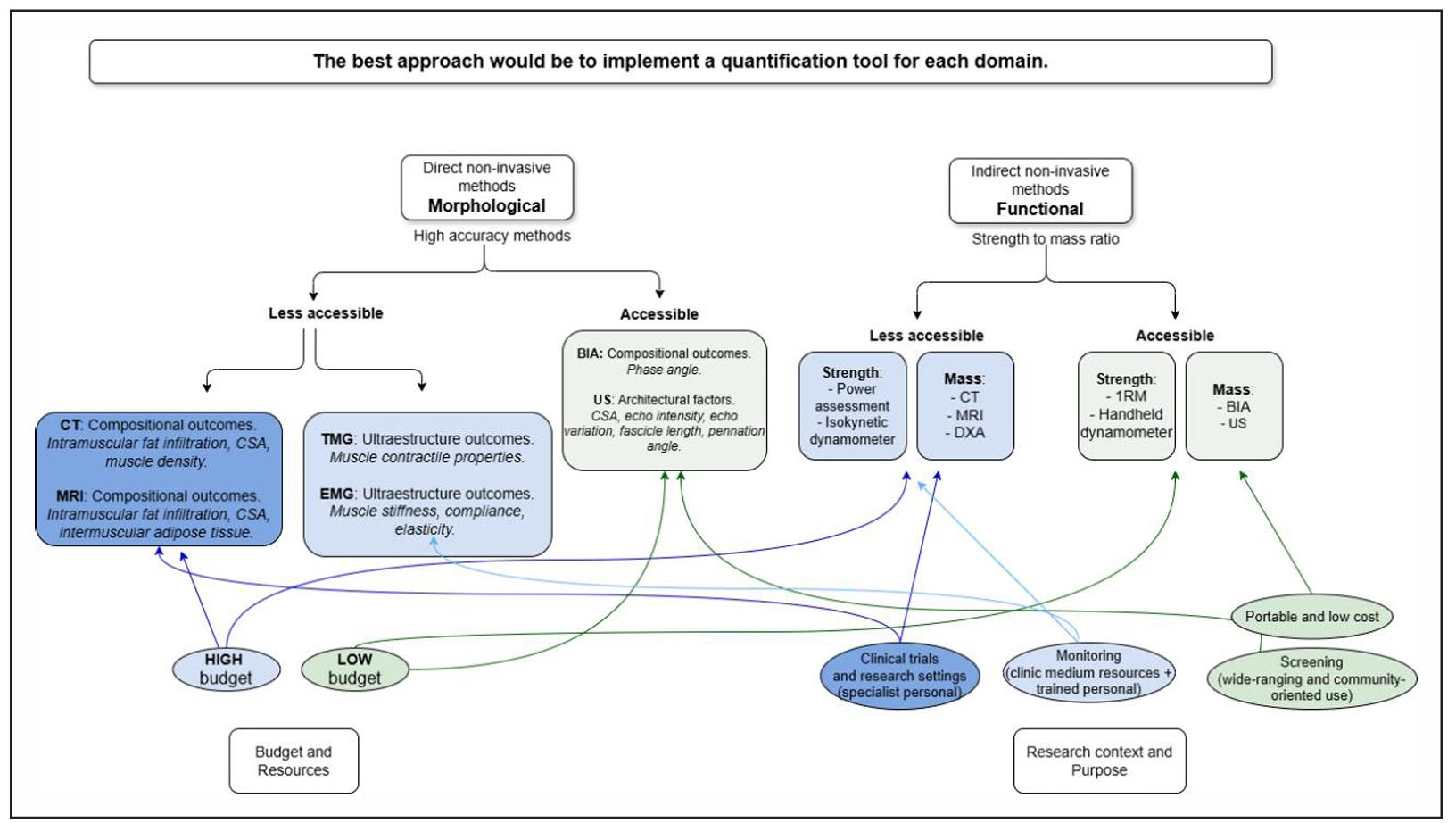 To assess functional MQ, commonly used tools are designed to measure both strength or power and muscle mass. These measurements are crucial as they form the basis for calculating the MQ index, estimated by indirect assessments of muscle performance in relation to muscle mass [3, 5, 6]. In terms of measurement tools for assessing MQ, each has specific applications in clinical practice. For measuring muscle strength, simpler tools such as isometric dynamometers and RM strength tests can be used, while more advanced devices such as power gauges and isokinetic strength testers offer more detailed assessments [2, 10, 11]. For muscle mass, there are several techniques: Bioelectrical Impedance Analysis (BIA), Dual energy Xray absorptiometry (DXA), B-Mode Ultrasound, Computed Tomography (CT) and Magnetic Resonance Imaging (MRI). Each tool provides different information on muscle mass, capturing measures such as muscle mass, lean mass, muscle thickness, muscle volume or cross-sectional area [9, 12, 13].