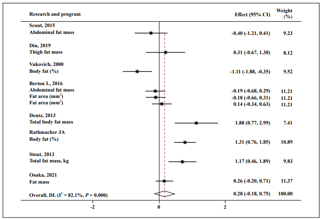 The outcomes of interest in this paper included the effect on body composition, strength, and physical function. If the dependent variable had multiple time points, only the pre-intervention and post-intervention values were selected. Meta-analysis was performed on the extracted data with Stata-SE. For the included studies, given the different ways used to measure muscle mass and strength, effect sizes were expressed as standardized mean differences (SMDs) with a 95% CI. SMD values of 0.2, 0.5, and 0.8 were defined as small, medium, and large effect sizes, respectively [11]. The heterogeneity of the included studies was determined by I2 (<50% was considered low, 50%–74.9% was considered moderate, and 75%-100% was considered high heterogeneity). The fixed-effects model was used when I2 was less than 50%; otherwise, the random-effects model was used.