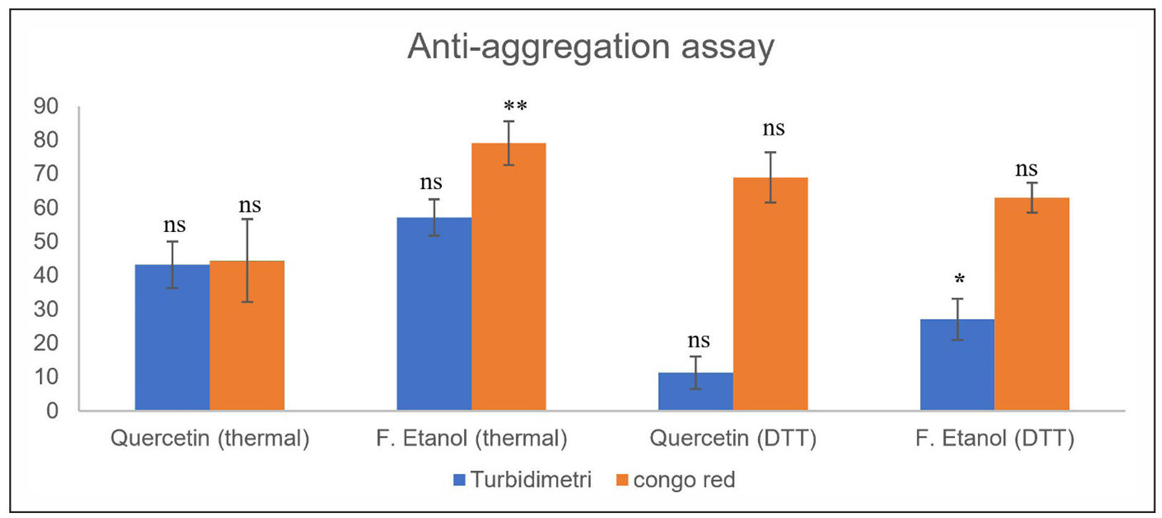 Figure 1. In vitro analysis of amyloidosis inhibition from ethanol fraction of fermented Swietenia macrophylla seeds. Different letters/symbols indicate significant differences between treatments within the same stress group (thermal or DTT), based on one-way ANOVA and Tukey’s HSD test. P < 0.01 was considered highly significant (**), P < 0.05 was considered significant (*), while ns indicates no significant difference. Comparisons were not made between thermal and DTT groups.