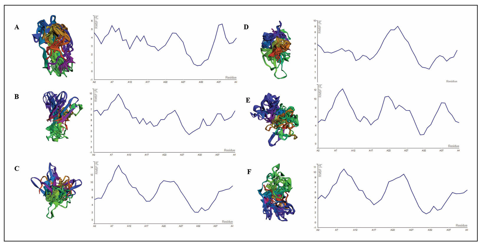 Figure 3. Visualization of molecular dynamic simulation β-amyloid with ligands using Cabs Flex 2.0. (A) Latrepirdine, (B) Myricetin, (C) Pyrogallol, (D) Gallocatechin, (E) Swietenine, (F) Swietenolide.