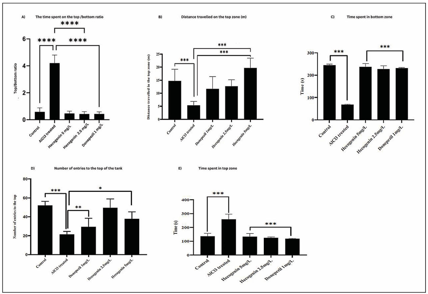 Figure 1. NTT analysis of control, aluminium chloride treated, aluminium chloride + hecogenin (5 and 2.5 mg/L) and aluminium chloride + Donepezil. The effects of Hecogenin (2.5 mg/L and 5 mg/L) and Donepezil (1 mg/L) on anxiety-like behavioral and cognitive performance were evaluated using the novel tank diving test. (A) Time spent in the top/bottom (B) Distance travelled in the top. (C) Time spent in the bottom. (D) Number of entries to the top zone. (E) Time spent at the top.