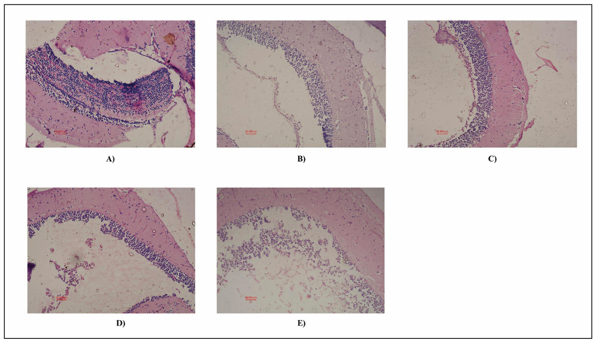 Figure 3. Histopathological analysis of zebrafish brain using H&E staining. Representative brain sections are shown. (A) Control (normal zebrafish brain), (B) Positive control (Donepezil treated), (C) Hecogenin 1a (5 mg/L), (D) Hecogenin 1b (2.5 mg/L), (E) Untreated (AlCl3 induced disease group).