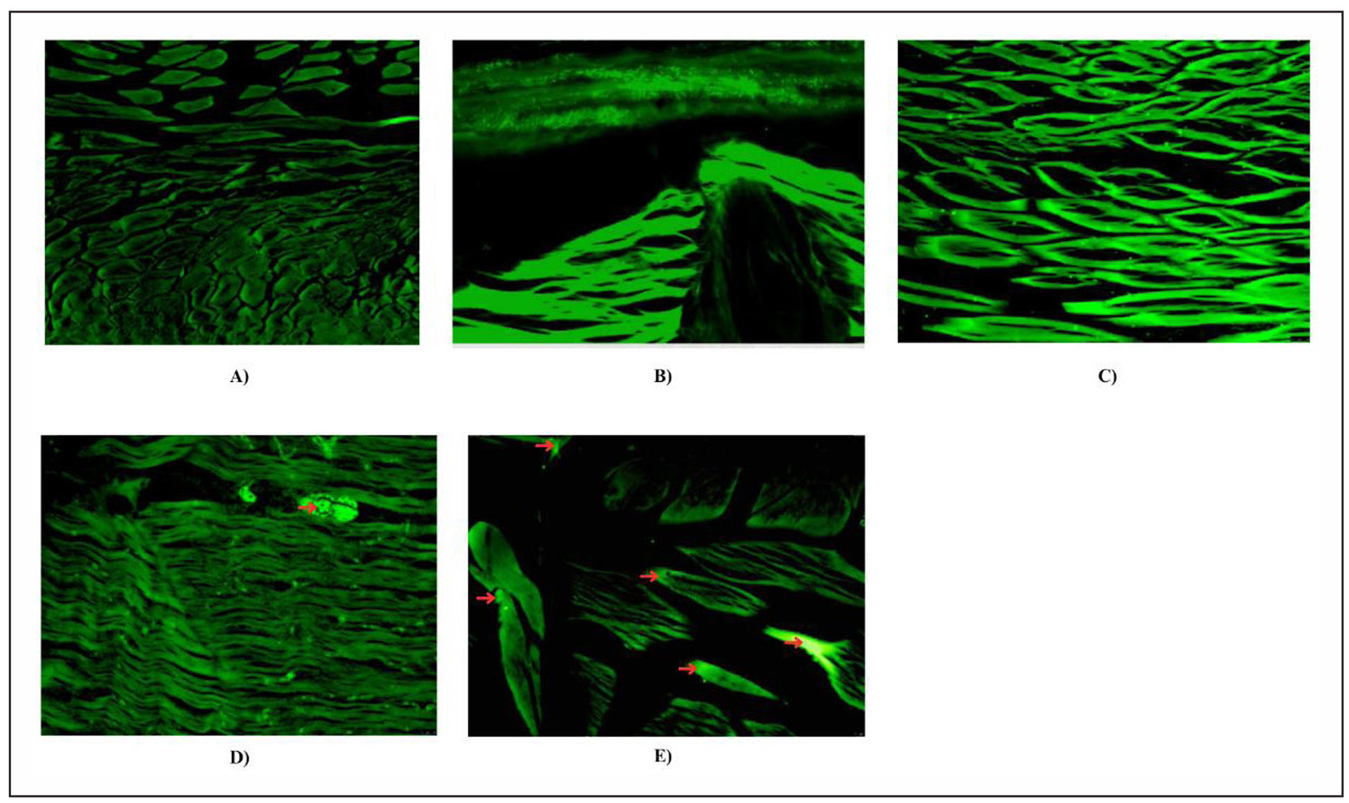 Figure 4. Histopathological analysis of zebrafish brain using Thioflavin S staining. Representative brain sections are shown. (A) Control (normal zebrafish brain), (B) Positive control (Donepezil treated), (C) Hecogenin 1a (5 mg/L), (D) Hecogenin 1b (2.5 mg/L), (E) Untreated (AlCl3 induced disease group). The amyloid-β plaques were marked using red color arrows. The intense green fluorescence corresponding to severe amyloid aggregation and marked tissue disorganization.