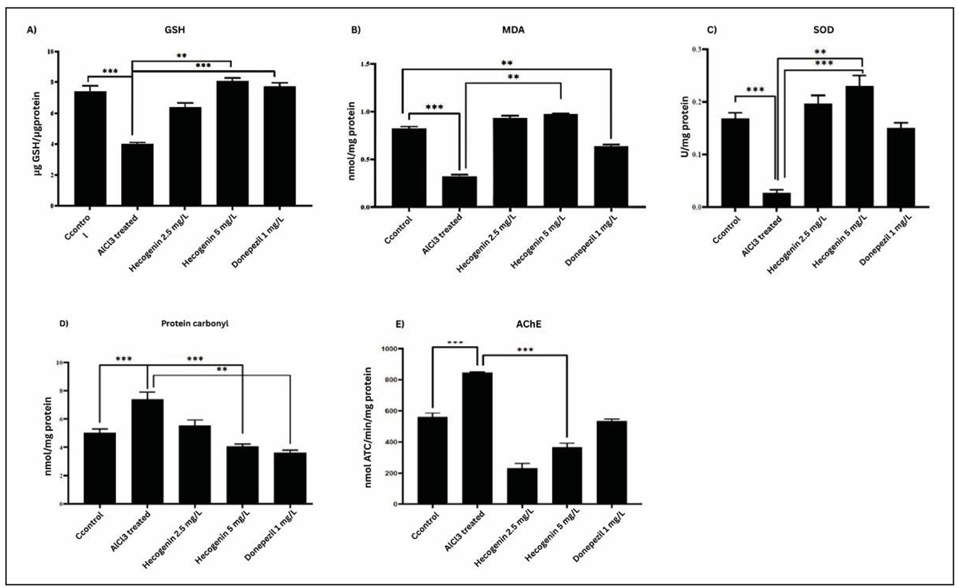 Reduced levels of protein carbonyl and lipid peroxidation was observed in hecogenin (5 mg/L and 2.5 mg/L) treated groups compared to the diseased group. The levels of protein carbonyl were found to be increased in aluminium chloride induced zebrafish due to lipid peroxidation. Donepezil was found to reduce protein carbonyl levels and lipid peroxidation in diseased zebrafish (Figure 5). This reduction in protein carbonyl content following hecogenin treatment indicates its protective role against oxidative protein damage, reflecting improved redox balance and decreased oxidative stress in neural tissues.