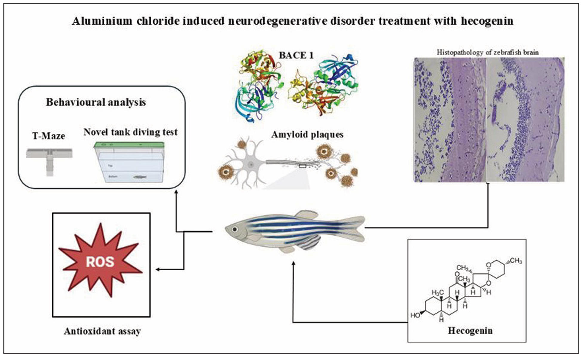Background: Alzheimer’s disease is a neurodegenerative disorder of the brain and the most prevalent form of dementia, affecting approximately 55 million people worldwide. It is characterized by the presence of tau tangles and amyloid-beta plaques. Medicinal plants have been used since ancient times for the treatment of the disease. A plant steroidal saponin compound hecogenin, found in Sida cordifolia, exhibits pharmacological properties like anti-inflammatory and gastroprotective agent, but its neuroprotective potential remains unexplored. The study investigated the neuroprotective properties of hecogenin against aluminium chloride induced toxicity in zebrafish, compared to the standard donepezil.