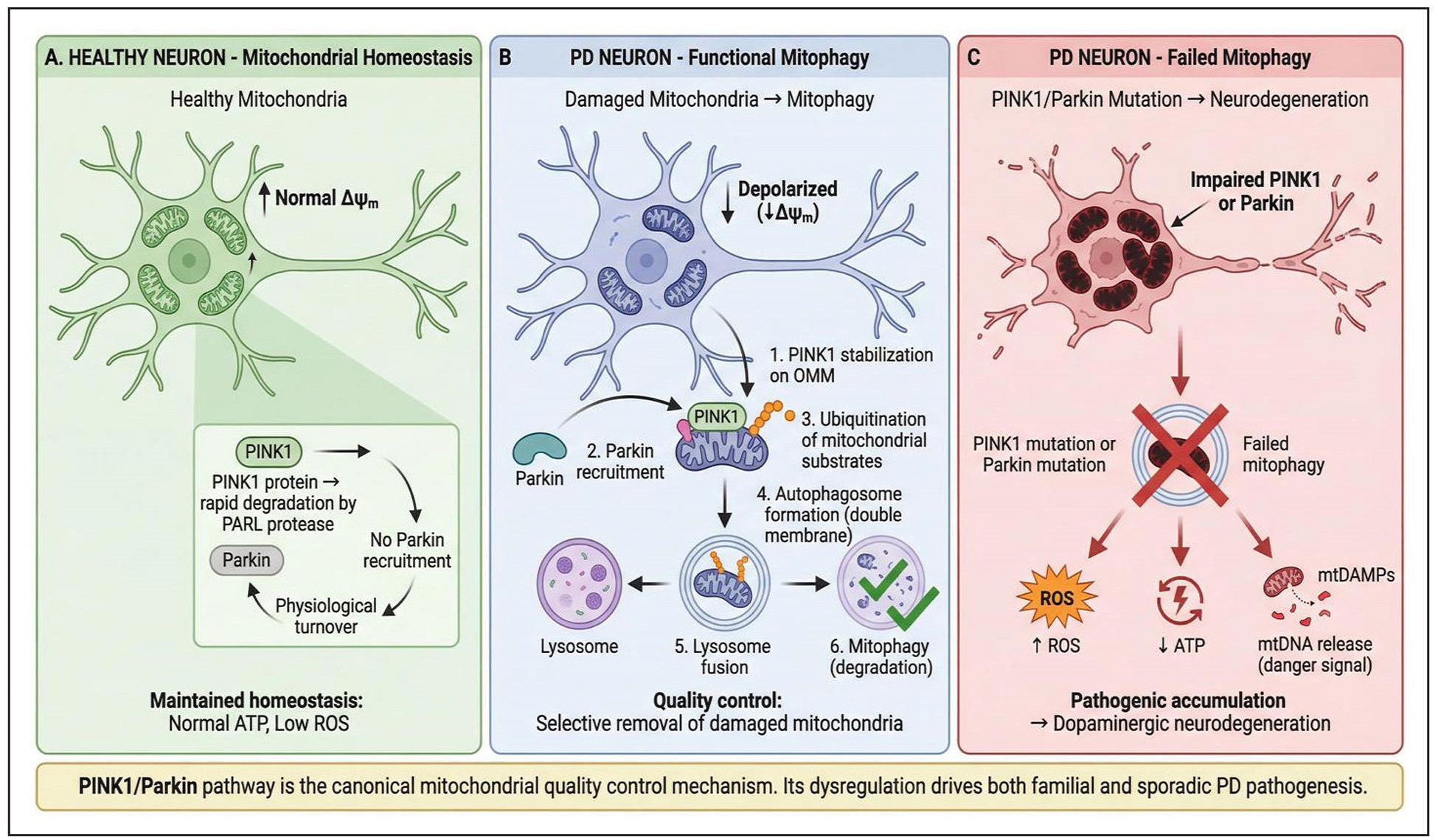 Figure 1. PINK1/Parkin-mediated mitophagy pathway in Parkinson’s disease. Three-panel comparison showing PINK1/Parkin-mediated mitophagy in healthy neurons (physiological turnover), PD neurons with functional mitophagy (quality control), and PD neurons with failed mitophagy (pathogenic accumulation leading to neurodegeneration). Establishes the biological foundation for understanding why mitophagy failure drives PD pathogenesis.