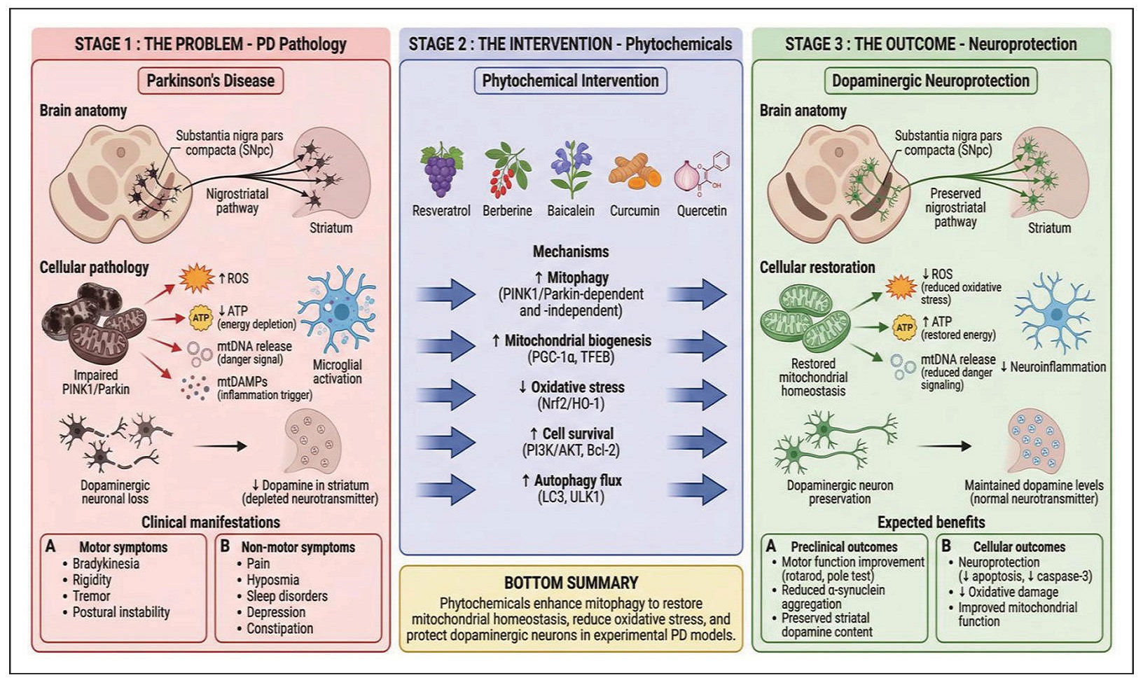 Figure 3. From mitophagy to dopaminergic neuroprotection: iranslational pathway. Left-to-right flow diagram showing the translational pathway from PD pathology (damaged mitochondrial, neurodegeneration, motor/non-motor symptoms) through phytochemical intervention (enhanced mitophagy via multiple mechanisms) to neuroprotection (restored mitochondrial homeostasis, preserved dopaminergic neurons, motor function improvement)