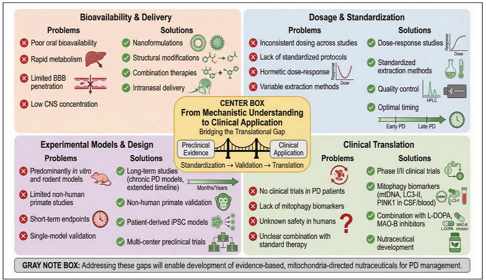Figure 4. Knowledge gaps and future directions: bridging the translational gap. Four-quadrant diagram addressing critical limitations (bioavailability, dosage / standardization, experimental design, clinical translation) and proposing solutions (nanoformulations, dose-response studies, long-term / primate models, clinical trials with biomarkers) for translating phytochemical-enhanced mitophagy from preclinical evidence to clinical application.