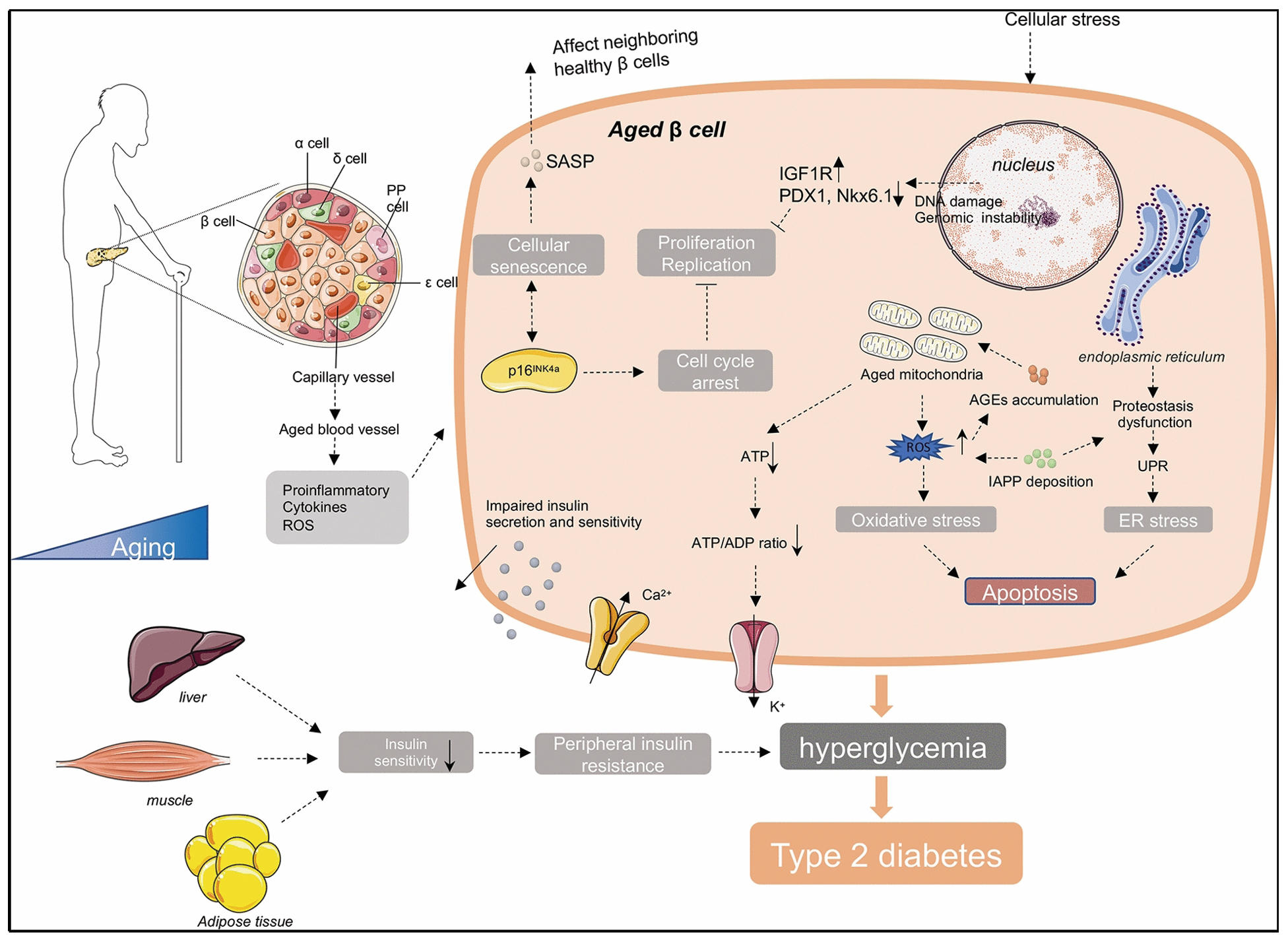 Figure 2. Aging-associated cellular stress and senescence in β-cell dysfunction leading to type 2 diabetes. Age-related mitochondrial dysfunction, oxidative and endoplasmic reticulum stress, impaired proteostasis, and SASP compromise insulin secretion and sensitivity, promoting hyperglycemia and systemic insulin resistance.