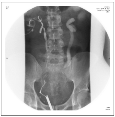 JW, a 37-year-old male presented with a chronic urinary infection. The patient has undergone a prophylactic total colectomy 10 years before for familial polyposis coli. Following surgery, the patient developed ureteral stricture bilaterally, that were managed by introducing ureteral double-J (DJ) stents bilaterally. The renal scintigraphy showed a severely reduced renal function over time, which finally resulted in 13% on the left side and 87 % on the right side. Physical examination was normal. Blood count, serum creatinine, and blood urea nitrogen (BUN) were normal. After placement of two percutaneous nephrectomies, the patient underwent an antegrade (APG) and retrograde ureteropyelography (UPG); both diagnostic procedures revealed bilateral hydroureteronephrosis with multiple right ureteral strictures (Figure 1).