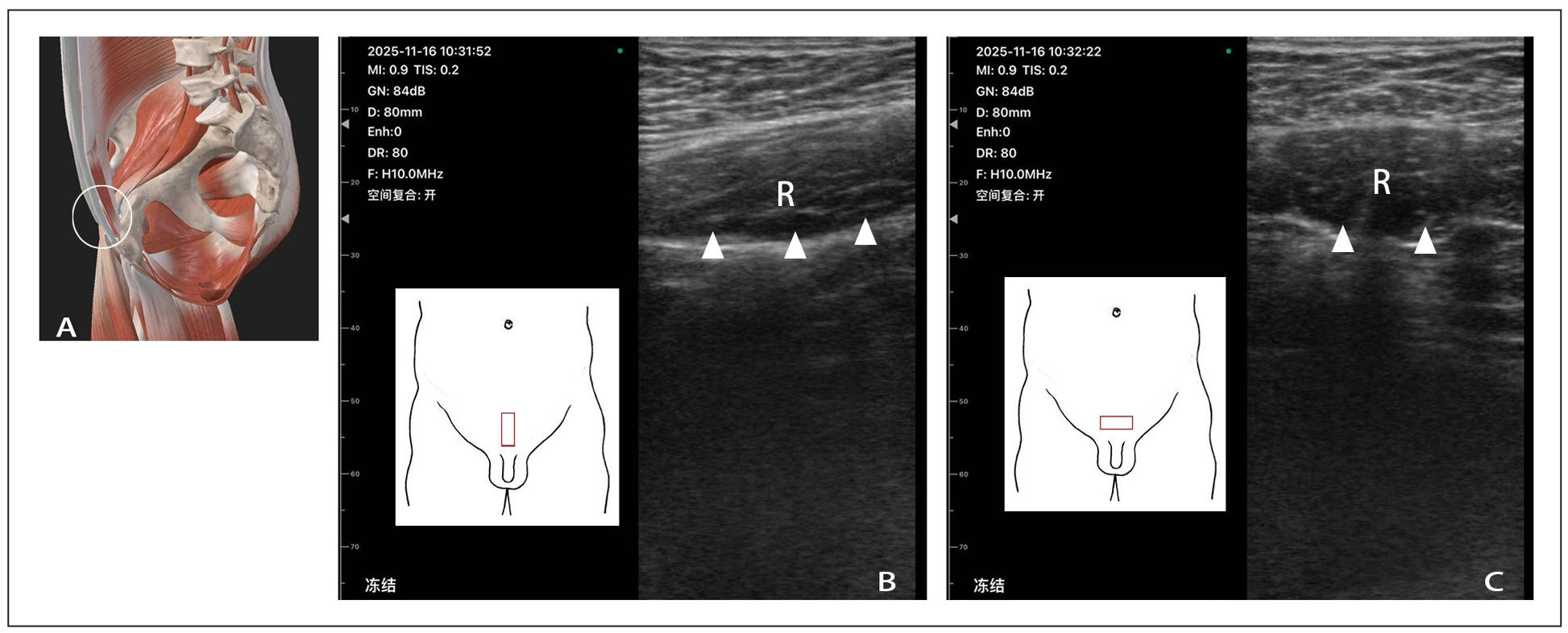 Figure 1. Musculoskeletal ultrasound scan in the muscles of the pubic region. (A) schematic diagram of anatomical structure; (B) abdominal longitudinal probe scanning; (C) abdominal transverse probe scanning; R: rectus abdominis; the white triangle refers to the area of inflammation and edema. The white circle represents the anatomical structure of the ultrasound scanning area. The red square represents the placement position of the probe
