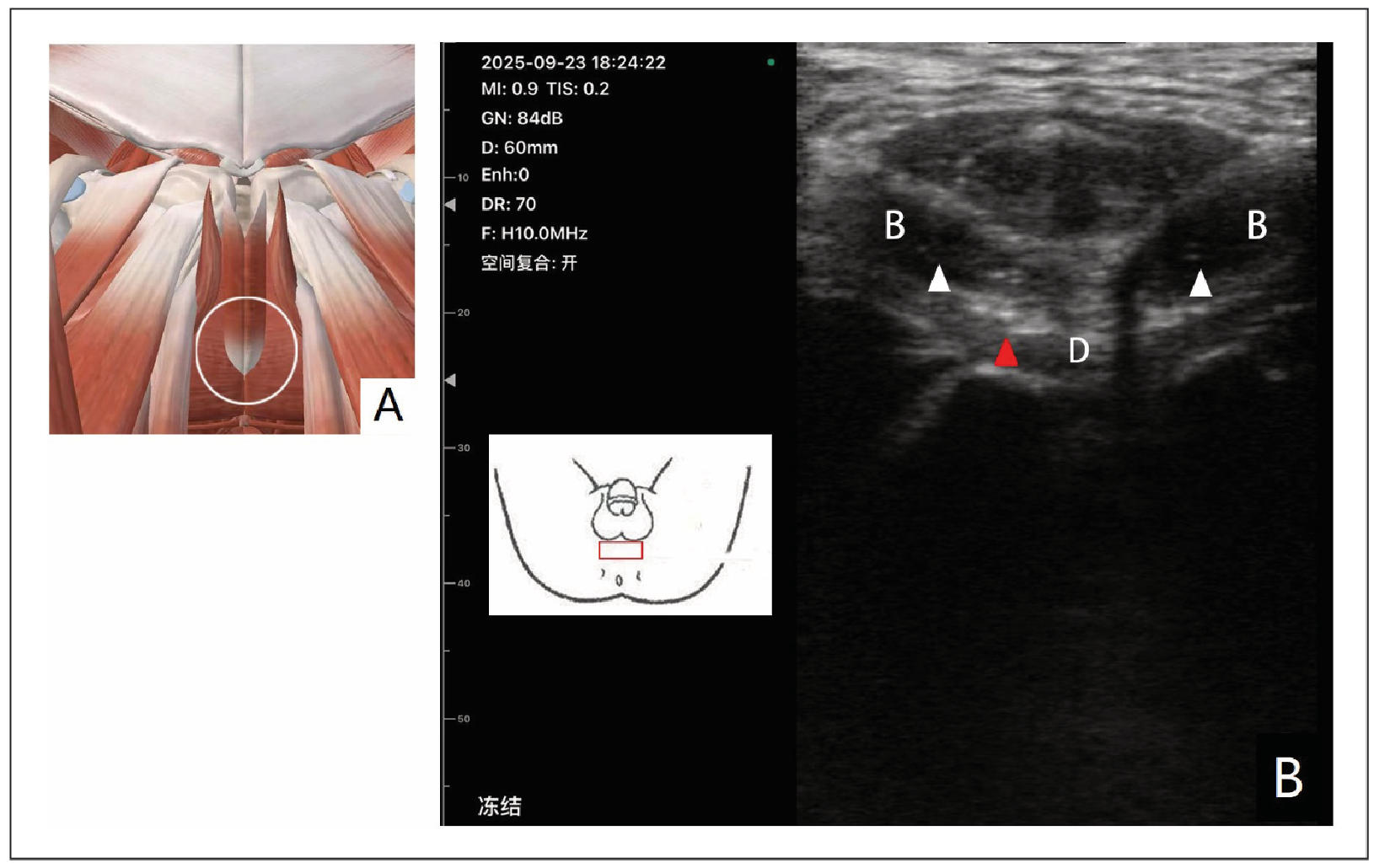 Figure 2. Musculoskeletal ultrasound scan in the perineal area (A) schematic diagram of anatomical structure; (B) ultrasound image of perineal muscle; the white triangle refers to the area of inflammation and edema. The white circle represents the anatomical structure of the ultrasound scanning area. The red square represents the placement position of the probe; the red triangle refers to the calcified area. B, Bulbospongiosus; D, Deep transverse perineal
