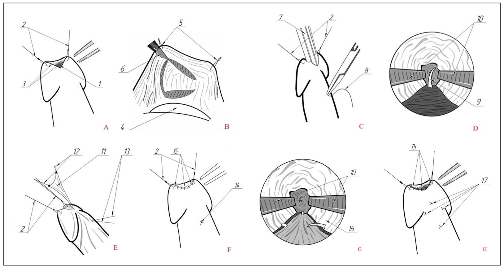 Figure 1. Stages of transurethral augmentation urethroplasty of the fossa navicularis of the urethra. (A) ventral urethrotomy, formation of an augmentation site. (B) the labial graft fence. (C) needle injection for subsequent ligation. (D) optical control of the injection point in the area of the proximal angle of the urethrotomy incision. (E) insertion of the graft into the urethra onto the formed site by traction of the ligature. (F) the final appearance of the penis after surgery. 1: ventral meatotomy. 2: stitches-holders. 3: the edges of the dissected urethra. 4: a gauze cloth placed at the base of the lower lip to push back the tongue. 5: stitches-holders. 6: scalpel. 7: endoscope. 8: application of the first suture on the proximal edge of the dissected urethra. 9: visualization of the needle during endoscopic examination. 10: tweezer branches. 11: labial graft. 12: stitches-holders at the corners of the triangular graft. 13: threads superimposed on the proximal edge of augmentation. 14: node on the proximal edge of augmentation. 15: nodular sutures on the distal edge of augmentation (meatus). 16: the edge of the urethral mucosa. 17: fixing seams on the top and sides of the triangular graft from the outside.